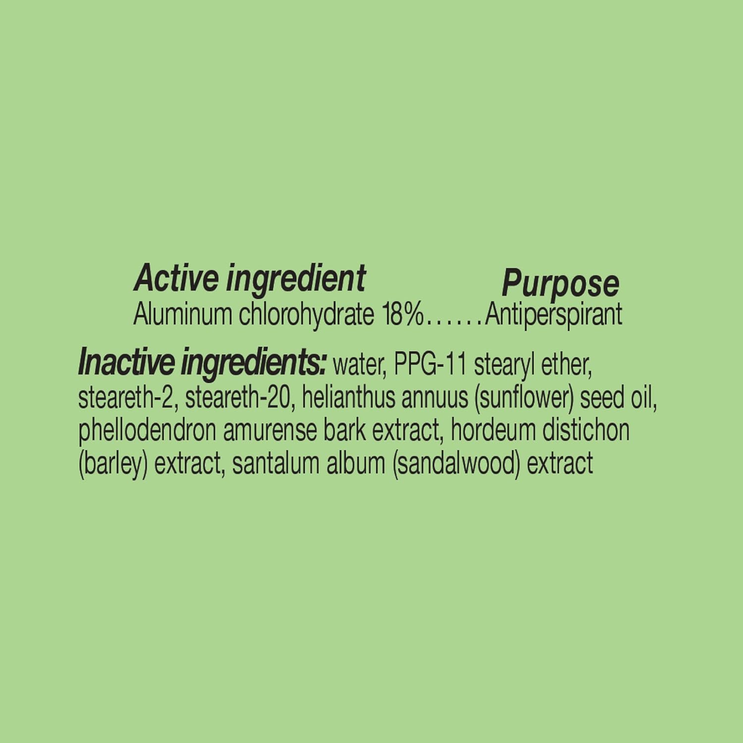 Active Ingredient: Aluminum Chlorohydrate (18%). Inactive Ingredients: Water, Ppg-11 Stearyl Ether, Steareth-2, Steareth-20, Sodium Silver Aluminum Silicate, Phellodendron Amurense Bark Extract, Santalum Album (Sandalwood) Extract, Hordeum Distichon (Barley) Extract, Fragrance, Disodium Edta.