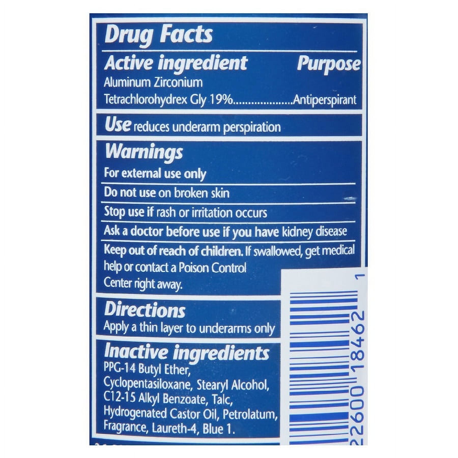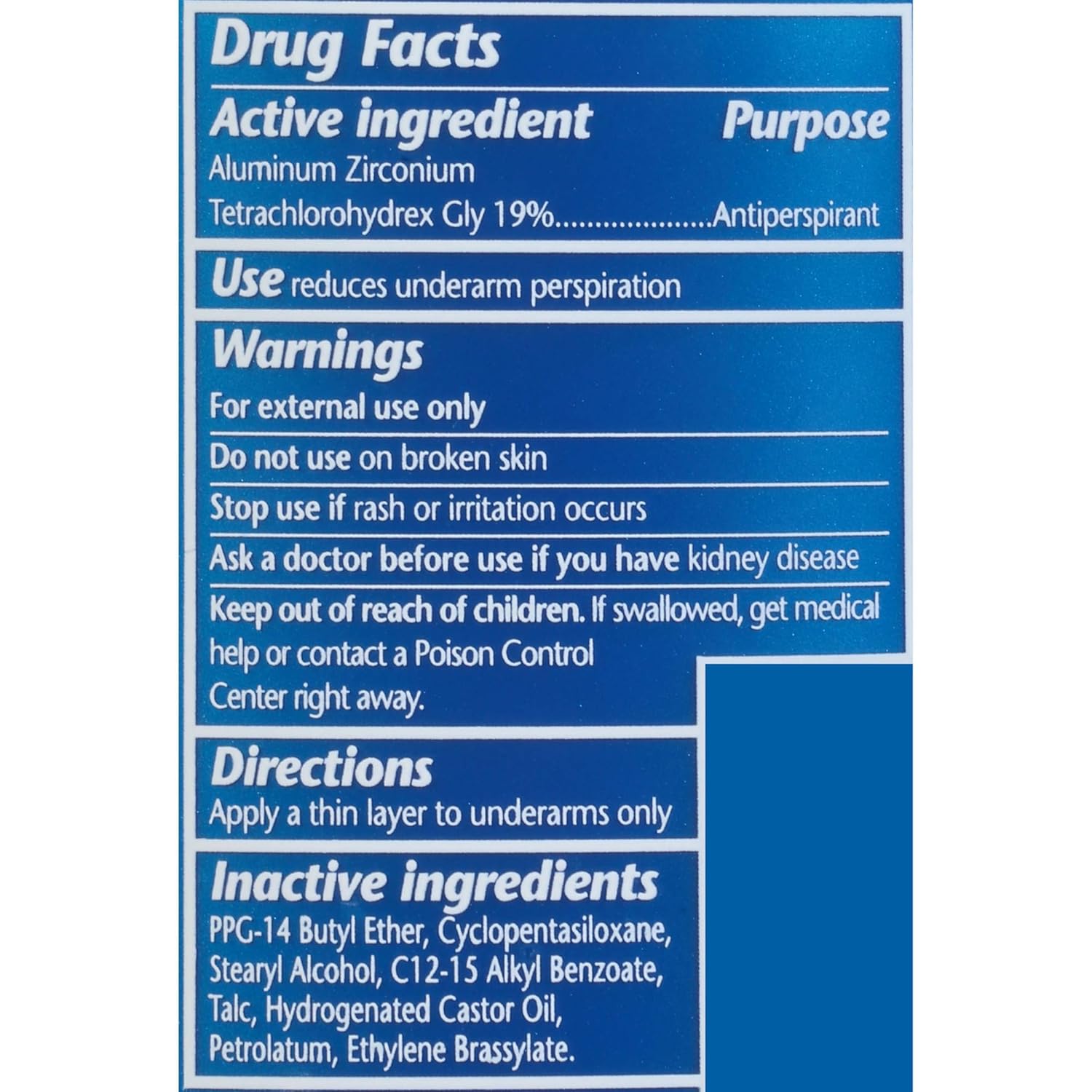 Aluminum Chlorohydrate (19%) Purpose: Antiperspirant; PPG-14 butyl ether, Cyclopentasiloxane, Stearyl alcohol, C12-15 alkyl benzoate, Talc, Hydrogenated castor oil, Petrolatum, Fragrance, Laureth-4, Blue Dye #1