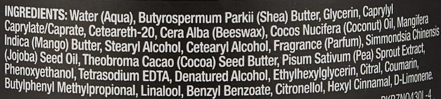 Aqua (Water), Butyrospermum Parkii Butter (Shea), Glycerin, Caprylate Acid, Ceteareth-20, Cera Alba (Beeswax), Cocos Nucifera Oil (Coconut), Cetearyl Alcohol, Mangifera Indica Butter (Mango), Stearyl Alcohol, Ricinus Communis Seed Oil (Castor), Phenoxyethanol, Fragrance, EDTA, Pisum Sativum Sprout Extract (Pea), L-Arginine, Sodium Benzoate, Morus Nigra Leaf Extract (Mulberry), Leuconostoc, Radish Root Ferment Filtrate, Lactobacillus, Capsicum Frutescens Fruit Ferment Extract, Lycium Barbarum Fruit Extract (Boxthorn), Coffea Arabica Seed Extract (Coffee), Euterpe Oleracea Fruit Extract (Acai), Morinda Citrifolia Fruit Extract (Great Morinda), Punica Granatum Extract (Pomegranate), Camellia Sinensis Leaf Extract (Camellia), Panax Ginseng Root Extract, Propylene Glycol, Prunus Persica (Peach) Fruit Extract, Cucumis Sativus Fruit Extract (Cucumber), Humulus Lupulus Cone Extract (Hops), Calendula Officinalis Flower Extract (Calendula), Camomile Derivative, Citrus Grandis Peel Oil (Grapefruit), Citral, Citronellol, Coumarin, Linalool. Warnings:This product contains nut-related ingredients that may cause an allergic reaction.