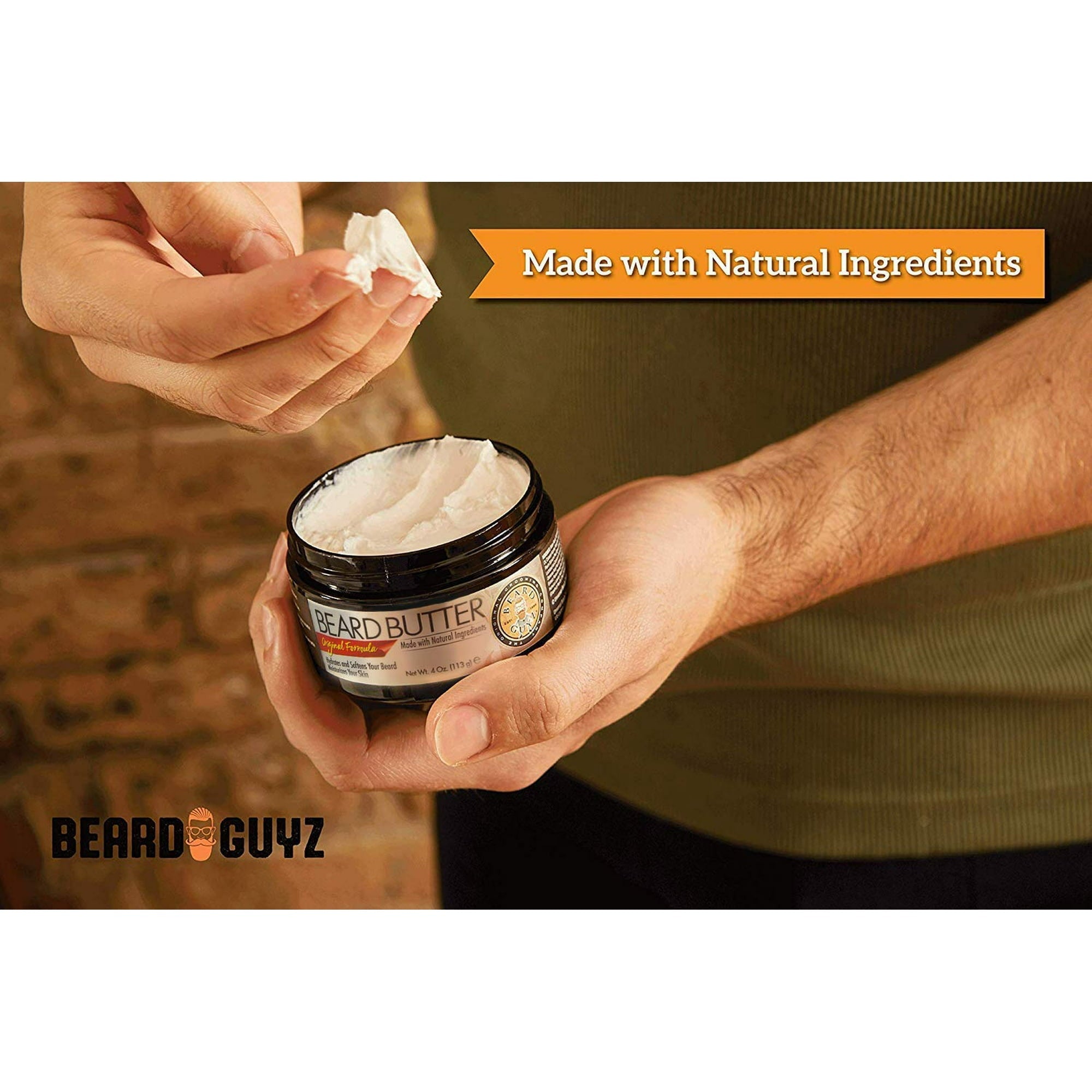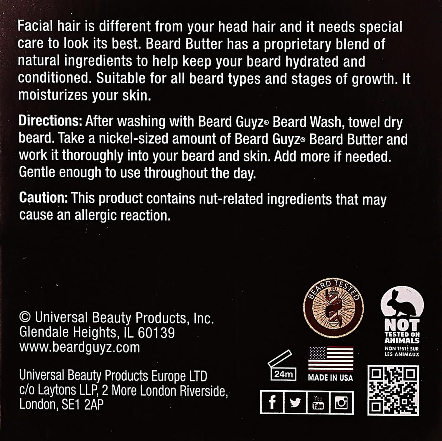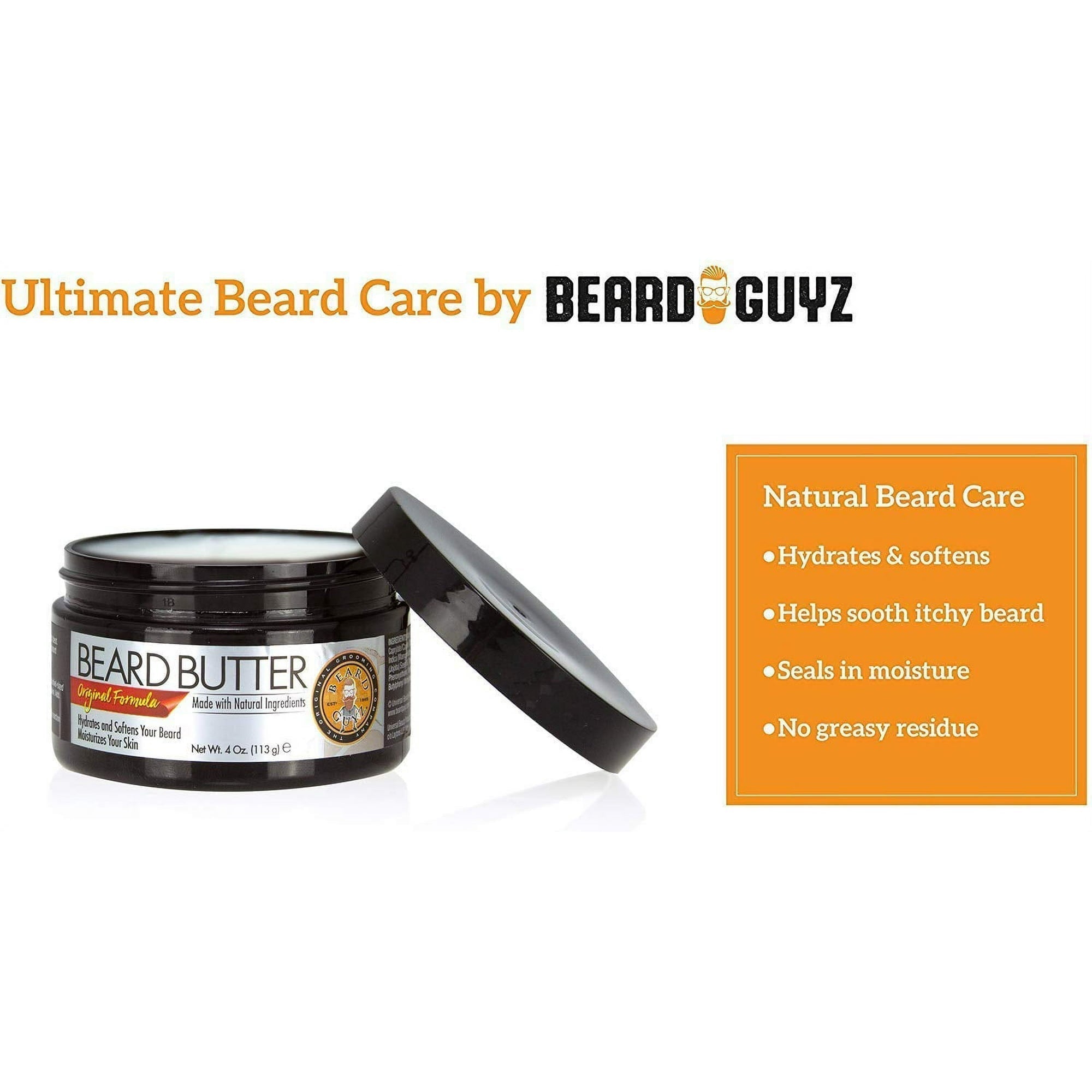 Beard Guyz Beard Butter- Hydrates & Softens Beard & Skin Original Formula 4 Ounce (Pack Of 1) This moisturizing beard butter is the best way to hydrate and soften your unruly beard. Our formula is enriched with natural ingredients such as coconut & grapeseed oils, and a unique blend of cocoa, shea and mango butters help to hydrate your skin and prevent irritation. This non-greasy product absorbs quickly and has a light, not over powering scent.