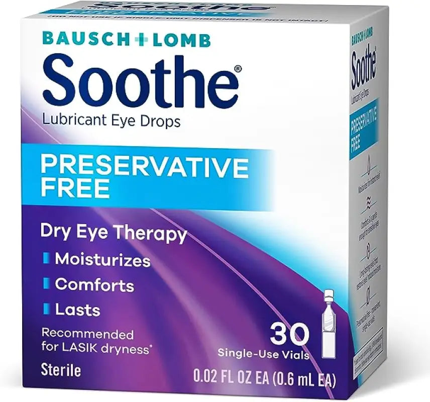 Bausch & Lomb Eye Drops, Dry Eye Therapy, 28 ct (PacK Of 1) Soothe Preservative Free lubricant eye drops from the eye care experts at Bausch + Lomb have a gentle formula that provides fast long lasting relief. This hydrating eye drop formula helps restore eyes natural moisture to relieve dry irritated eyes. Its gentle enough for sensitive eyes and LASIK dryness* and can be used as often as needed. There are 30 single-use lubricating eye drop vials included. Soothe Preservative Free eye drops for dry eyes relieve dryness and prevent further irritation in convenient single-dose vials