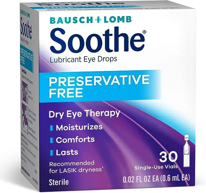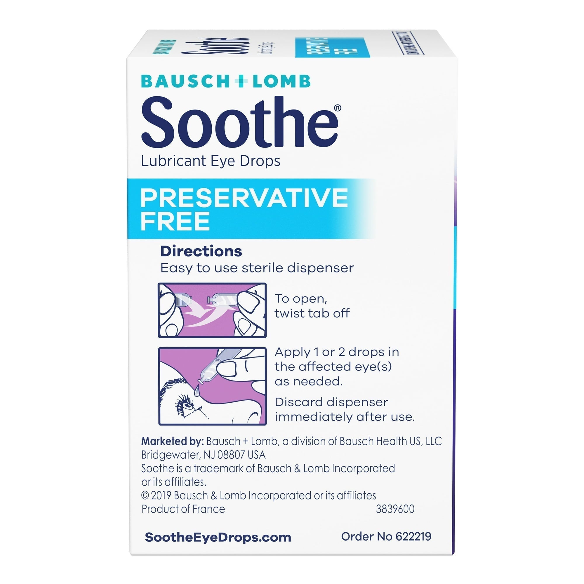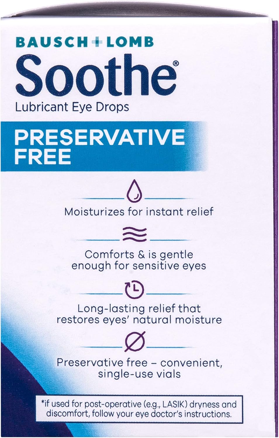 Bausch & Lomb Eye Drops, Dry Eye Therapy, 28 ct (PacK Of 6) Soothe Preservative Free lubricant eye drops from the eye care experts at Bausch + Lomb have a gentle formula that provides fast long lasting relief. This hydrating eye drop formula helps restore eyes natural moisture to relieve dry irritated eyes. Its gentle enough for sensitive eyes and LASIK dryness* and can be used as often as needed. There are 30 single-use lubricating eye drop vials included. Soothe Preservative Free eye drops for dry eyes relieve dryness and prevent further irritation in convenient single-dose vials