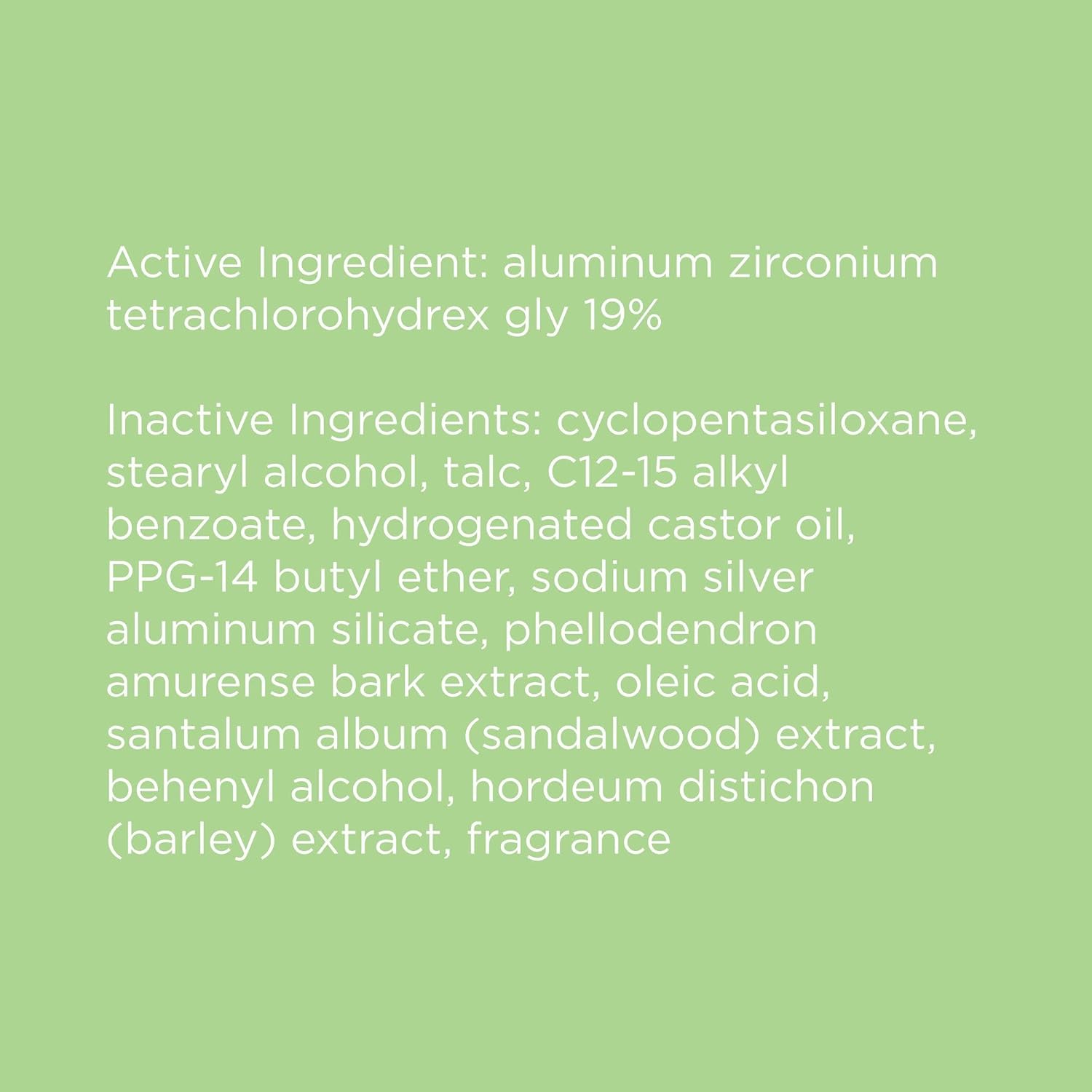 Active Ingredient: Aluminum Chlorohydrate (18%). Inactive Ingredients: Water, PPG-11 Stearyl Ether, Steareth-2, Steareth-20, Sodium Silver Aluminum Silicate, Phellodendron Amurense Bark Extract, Santalum Album (Sandalwood) Extract, Hordeum Distichon (Barley) Extract, Fragrance, Disodium EDTA.