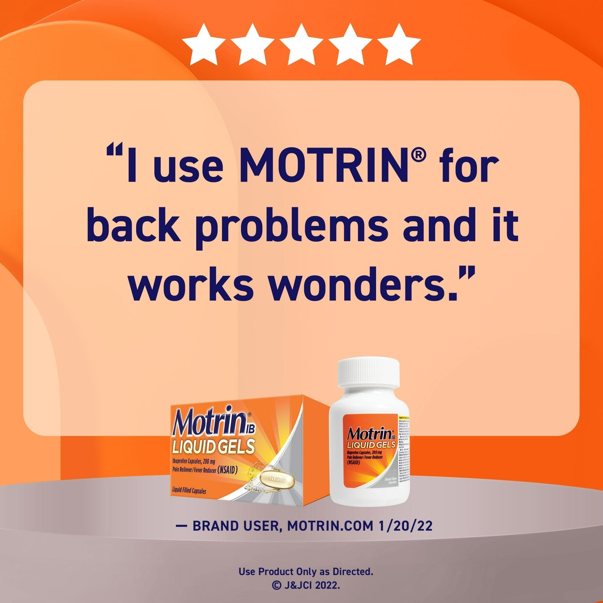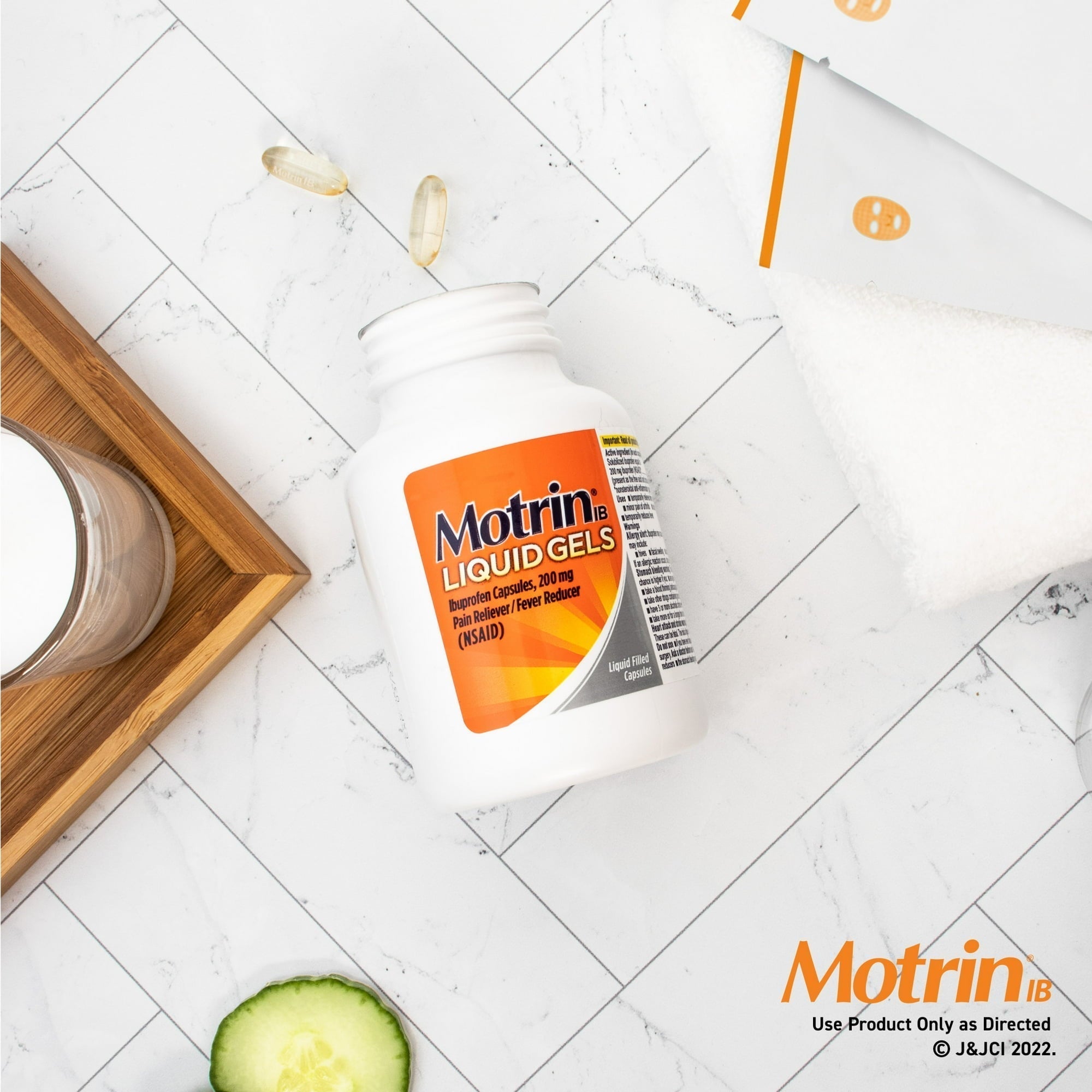 - 20-count bottle of Motrin IB liquid gels with the NSAID ibuprofen pain reliever for fastacting, effective relief from minor aches and pains, to help you and your family take control of their pain
