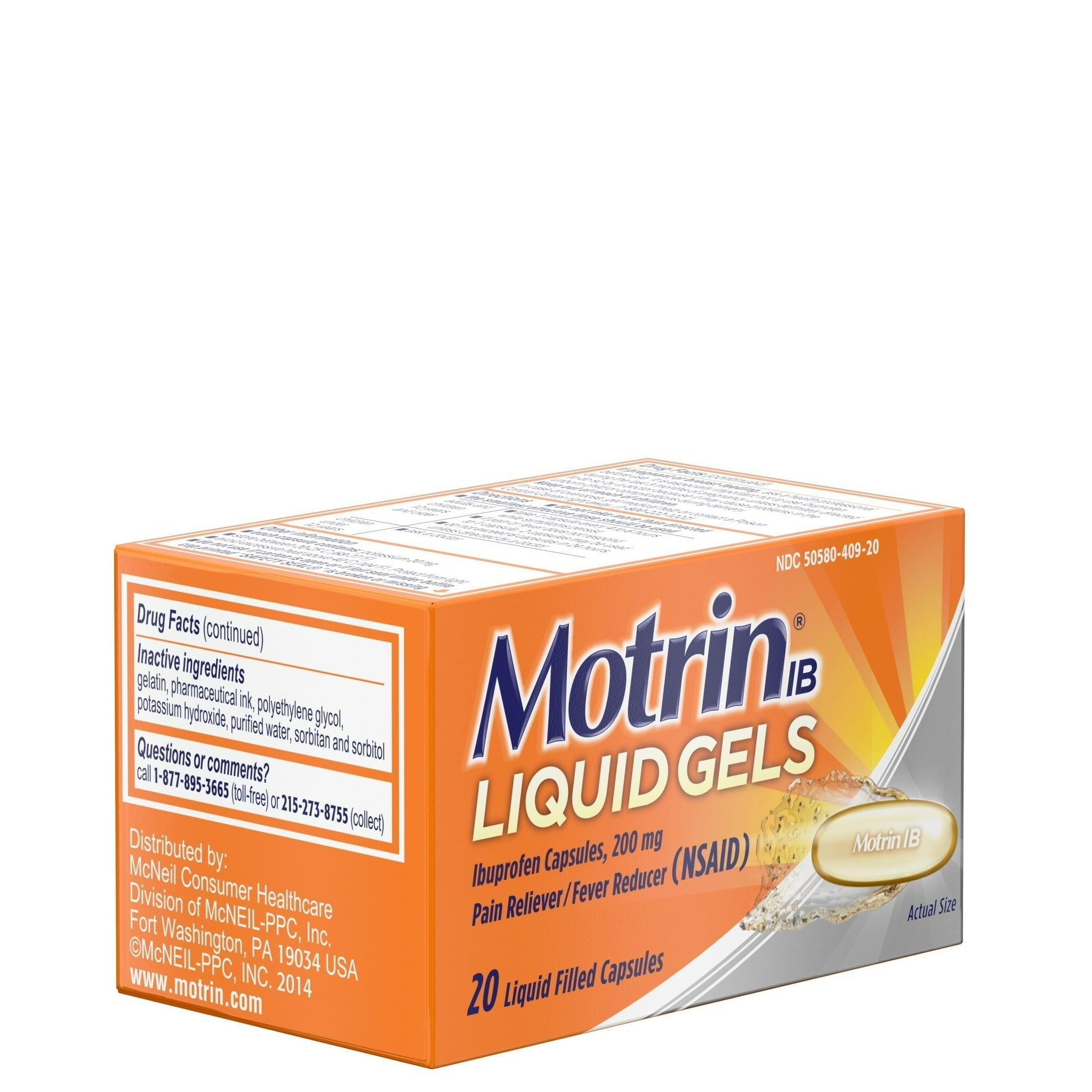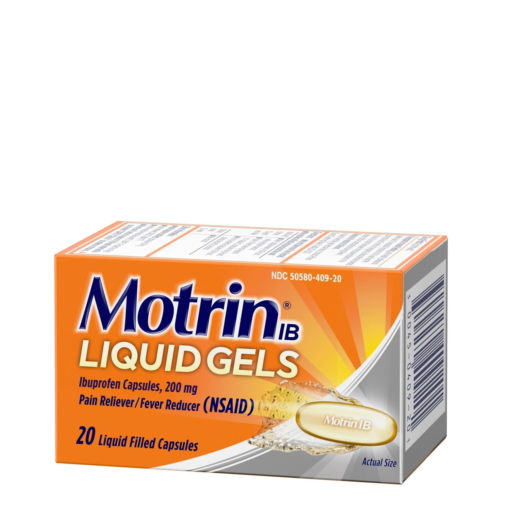 Motrin IB Liquid Gels Ibuprofen Capsules, Pain Relief & Fever Reducer, 200 Mg 20 Count (Pack Of 2) Motrin IB Liquid Gels that each contain 200 mg of the NSAID ibuprofen. These fast-acting pain reliever liquid gels temporarily relieve minor aches and pains due to headache, muscular aches, minor pain of arthritis, toothache, backache, menstrual cramps, and the common cold, while also providing temporary fever relief.