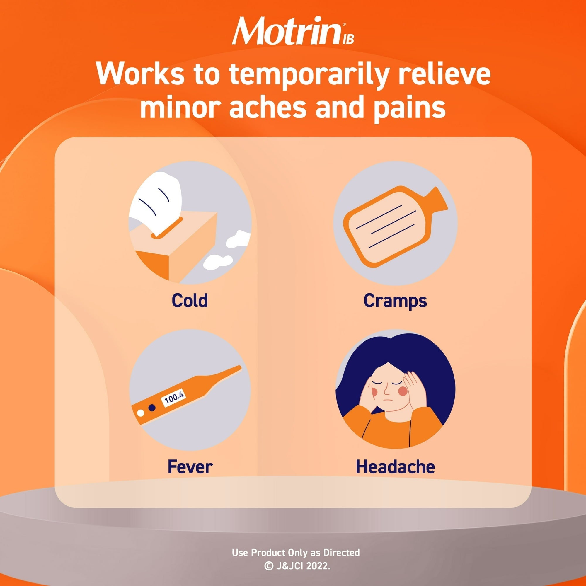- Motrin IB liquid gels temporarily reduce fever and relieve pain due to the common cold, headache, backache, toothache, menstrual cramps, and minor pain of arthritis