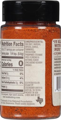 Stubb's All Purpose BBQ Barbecue Rub, With sea salt, paprika and garlic, 4.62 Ounce (Pack Of 6) Stubb's Bar-B-Q Rub is the original rub, crafted by Stubb himself. This blend of sea salt, paprika, garlic and hickory smoke flavor is just right for brisket, pork or chicken. C.B. Stubblefield, known as Stubb opened his first bar-b-q joint in 1968 in Lubbock, Texas.