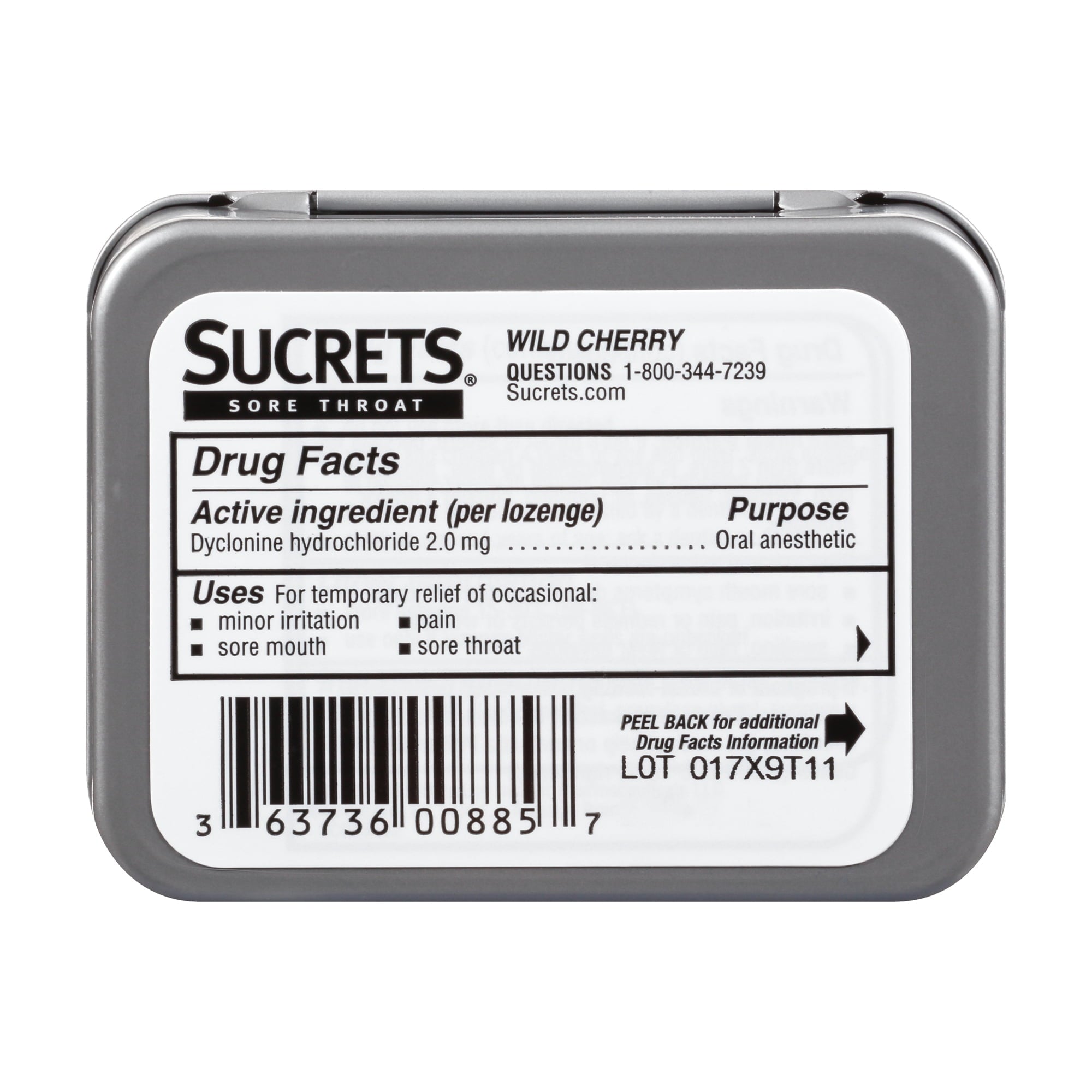Sucrets Sore Classic Throat Lozenge, Original Formula, Wild Cherry, 18 Count (Pack Of 24) Sucrets Wild Cherry Sore Throat Lozenges temporarily relieve occasional minor irritation, pain, sore throat and sore mouth. The lozenges contain dyclonine hydrochloride to provide sore mouth and throat relief. Allow the lozenge to slowly dissolve in the mouth and may be repeated every 2 hours as needed or as directed by a dentist or a doctor. Recommended for use in adults and children 4 years and older. Sucrets Lozenges come in a convenient, portable tin for fast-acting relief at home and on-the-go.