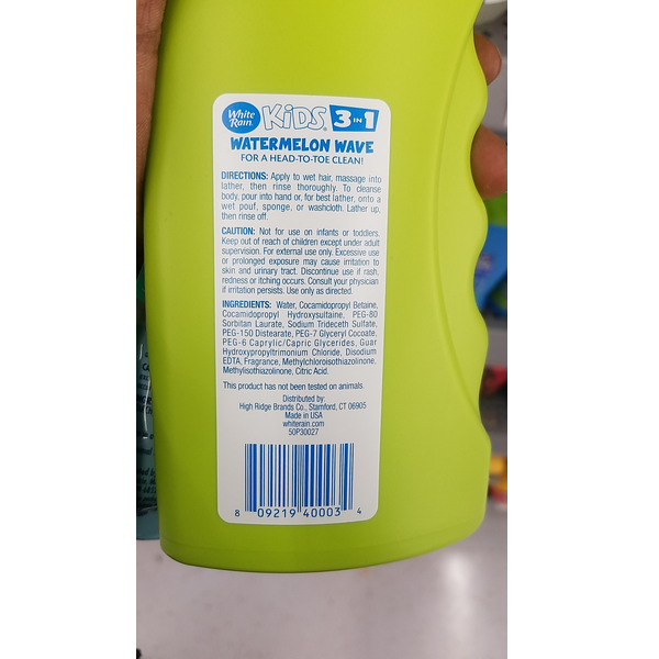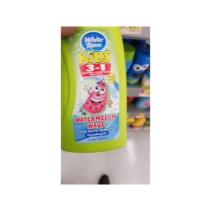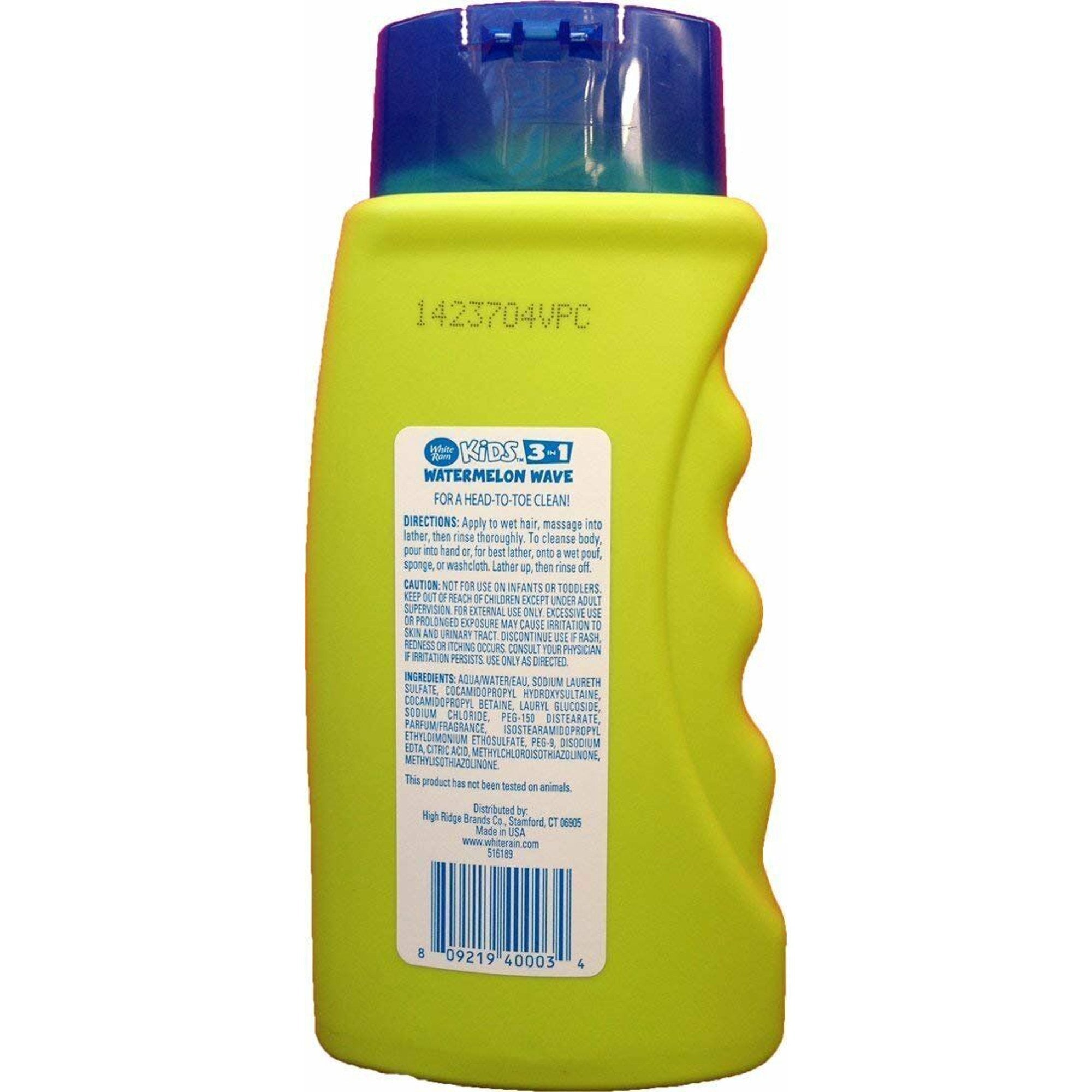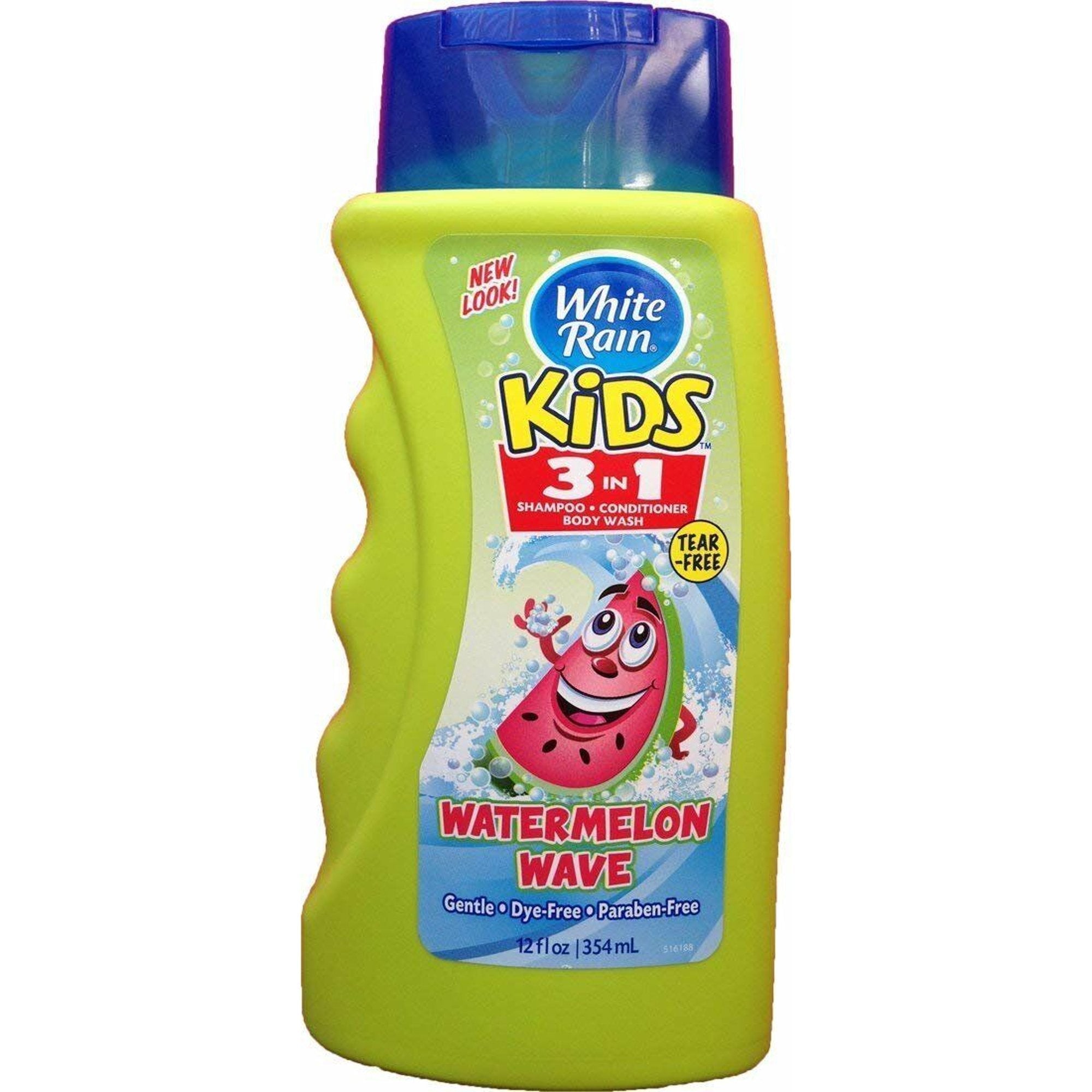 White Rain Kids 3in1 Zany Watermelon Shampoo, Conditioner and Body Wash 12 oz (Pack Of 12) Developed especially for kids, this tear-free formula cleans, conditions and detangles hair while gently cleansing skin, eliminating dirt and sweat from a hard day of play. White Rain Kids 3 in 1 Zany Watermelon Hair Shampoo 12 oz UPC: 809219400034. Kids will love taking a bath or shower with this head-to-toe body wash, shampoo and conditioner, all-in-one. Get your kids head-to-toe clean with our gentle, dye and paraben-free formula. Switch from tears to smiles with the 3-in-1 shampoo, conditioner, and body wash kids love.