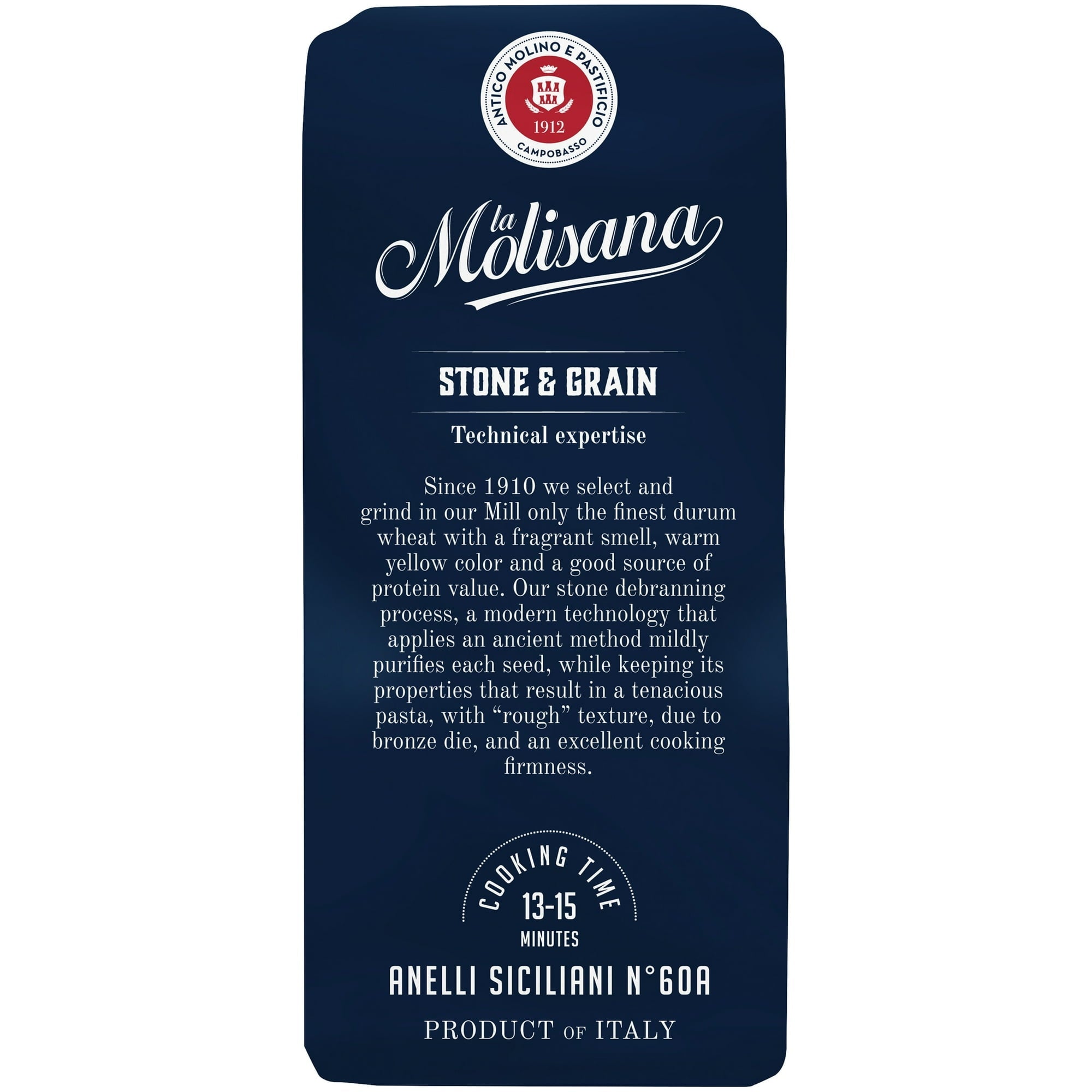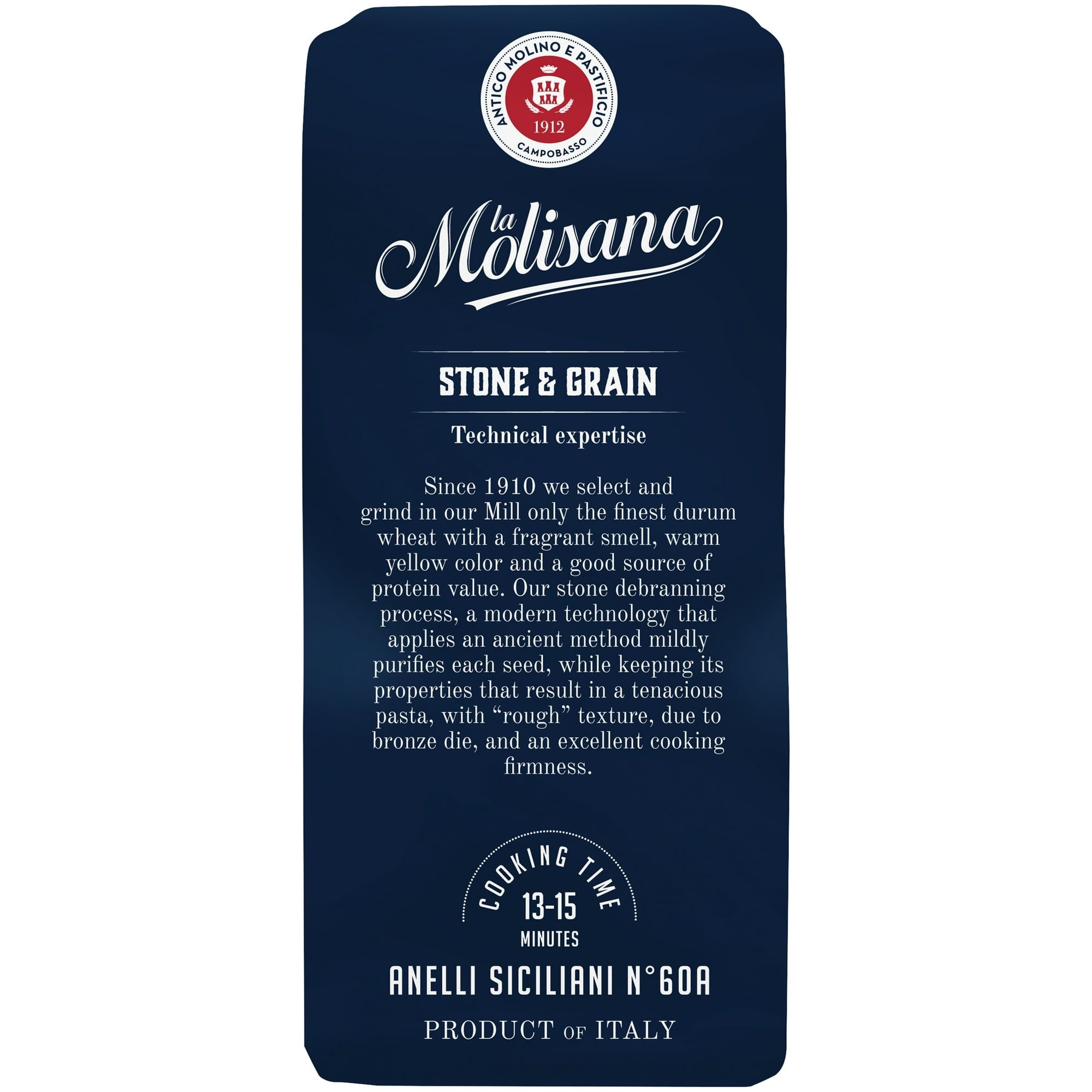 La Molisana Durum Wheat Semolina, Imported Italian Mezzi Rigatoni Bronzo Pasta, 16 Ounce (Pack Of 6) La Molisana's millers and pasta makers. For centuries Molise with its fertile soil and mild climate has been known for and still is one of the best granaries of Italy. It is a land blessed by extraordinary beauty a haven of peace and a treasure trove of authentic flavors. This is the essence of a land that feeds and enlivens La Molisana's history from year to year. The lifestyle is natural and healthy making time for fundamental values every day. In the kitchen this translates to delicious foods made simply from flour and water.