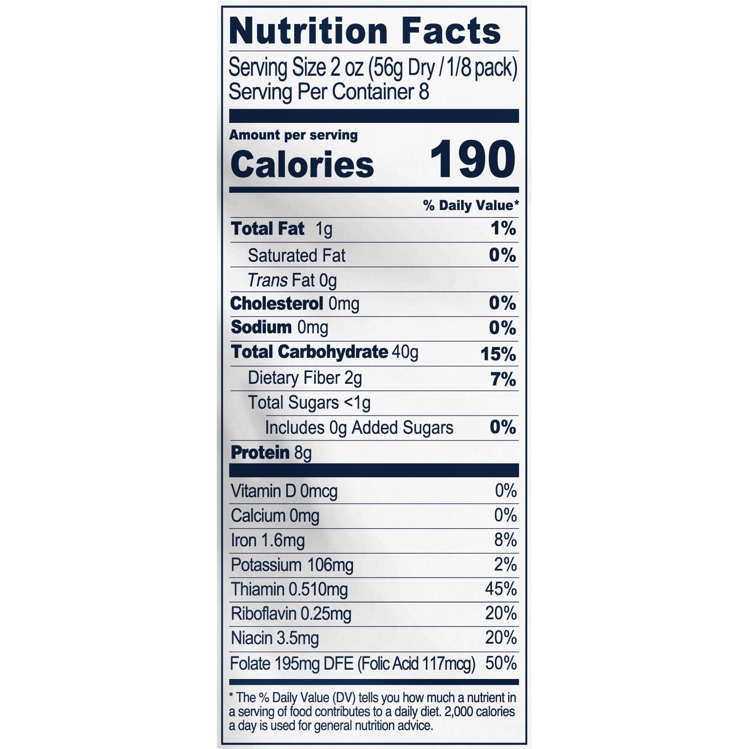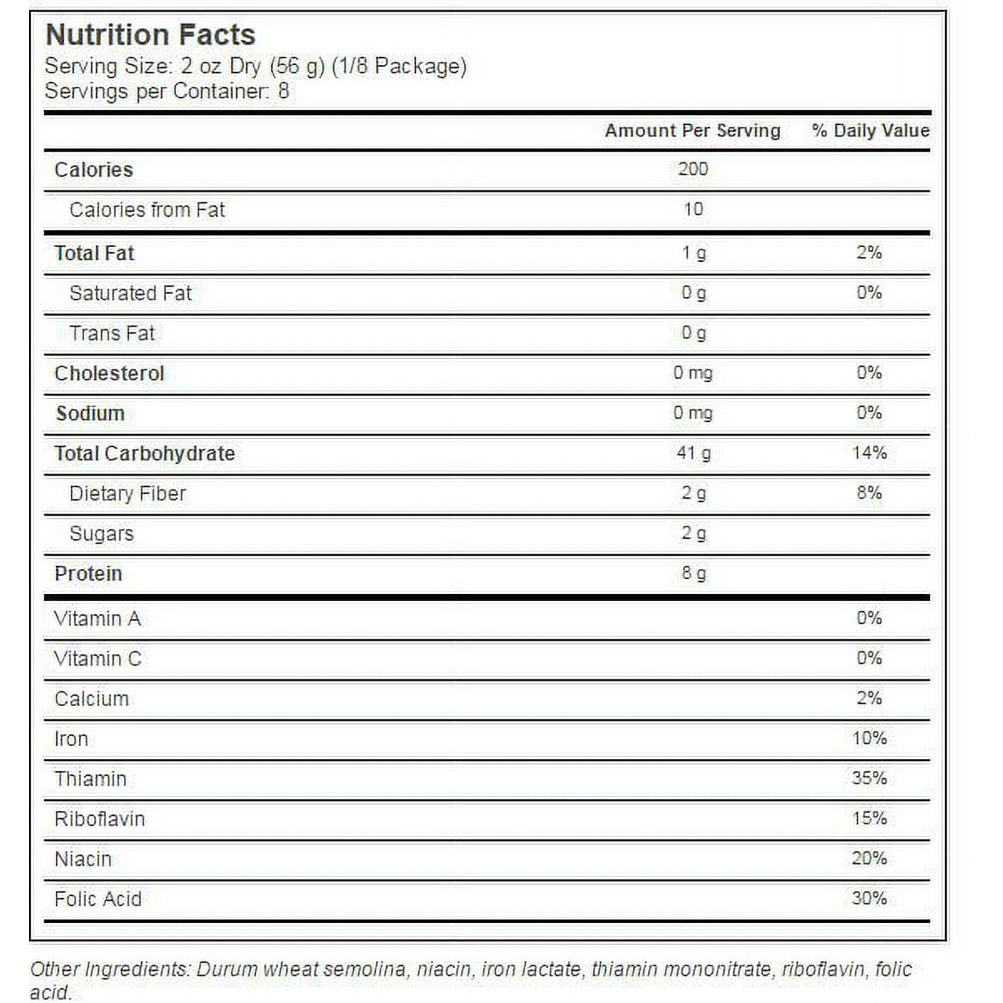 Durum Wheat Semolina, Folic Acid, Niacin, Iron Lactate, Thiamin Mononitrate, Riboflavin.