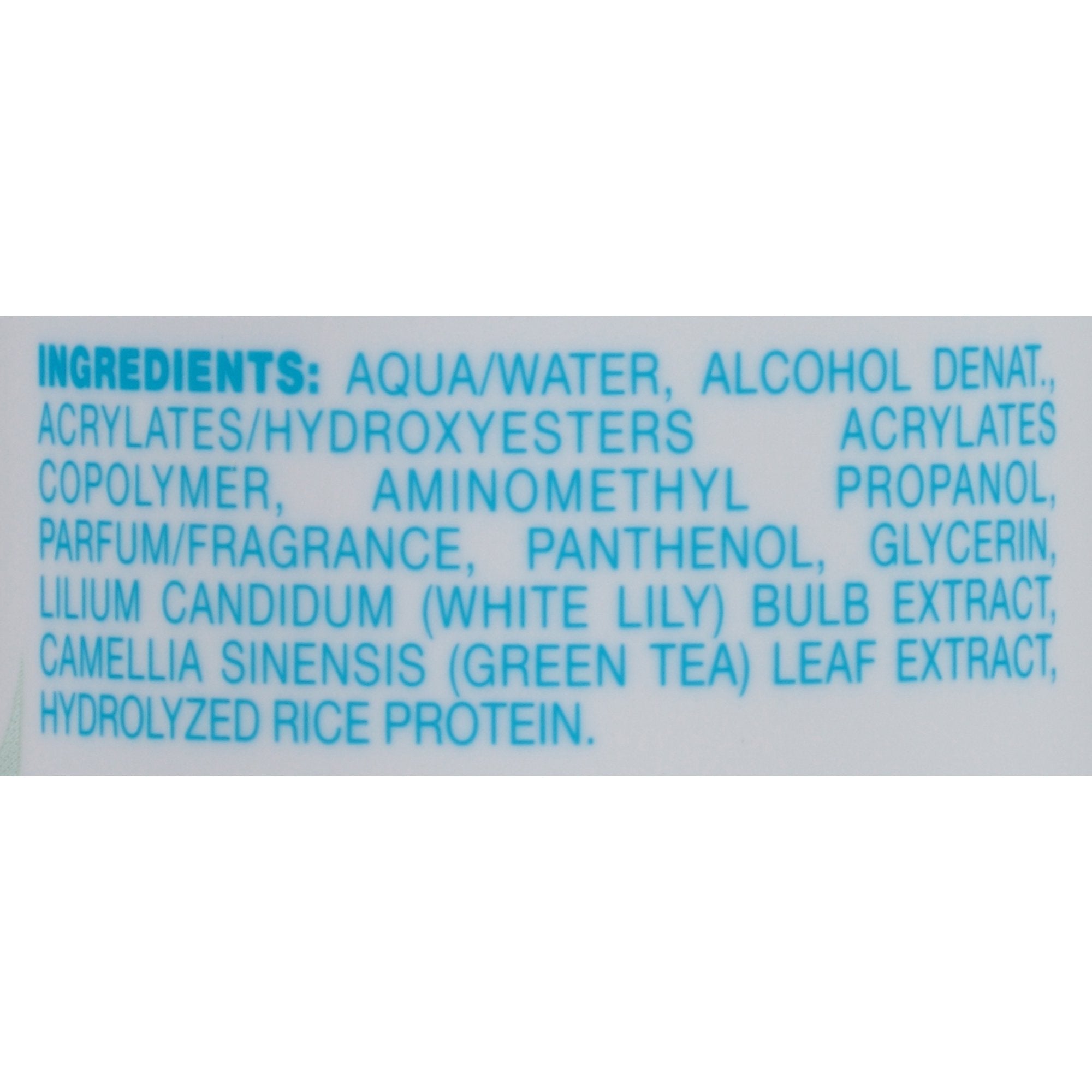 Water, SD Alcohol 40-B, Acrylates Copolymer, Aminomethyl Propanol, Fragrance, Disiloxane, PPG-12, Dimethicone, Glycerin, Lilium Candidum (White Lily) Bulb Extract, Camella Sinensis (Green Tea) Leaf Extract, Hydrolyzed Rice Protein