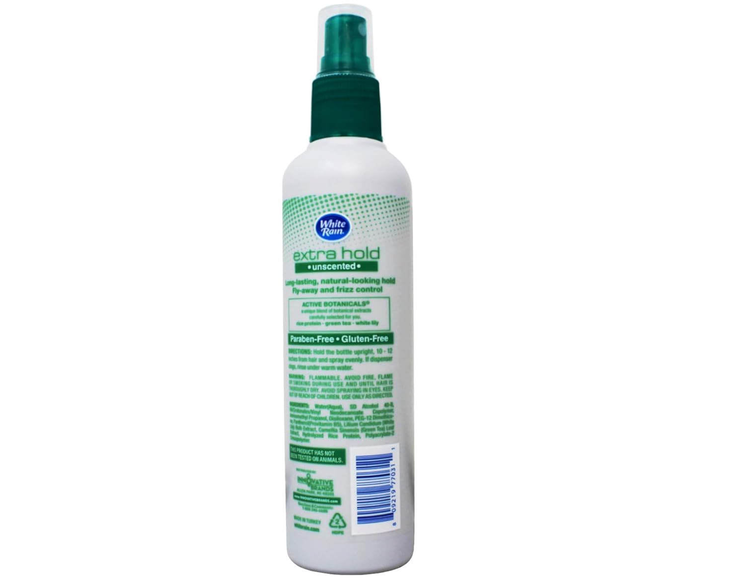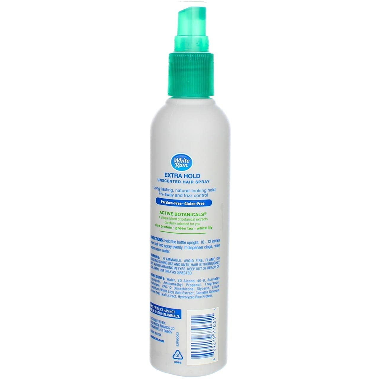 White Rain Non-Aerosol Hair Spray Unscented Extra Hold 7 Ounce (Pack Of 10) White Rain Advanced Formula Extra Hold Hair Spray is an unscented, long-lasting hair spray that provides a stronghold and a natural-looking finish. This is a perfect styling companion for achieving a flawless and long-lasting hairstyle without overpowering fragrances. For extra boost and hold; Long-lasting hold frizz control; Provitamin B5; With provitamin B5. Our Extreme Hold Unscented Aerosol Hairsprays provide your hair with a natural-looking hold and control.