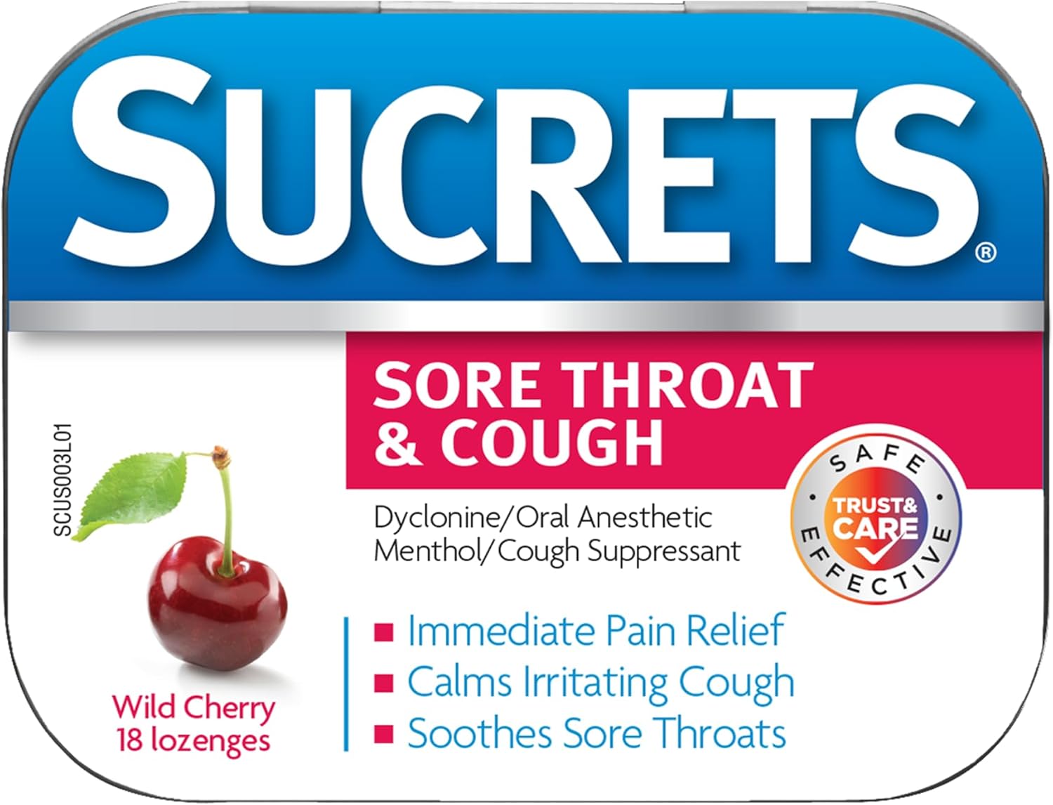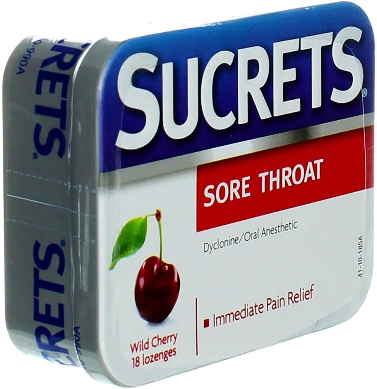 Sucrets Sore Classic Throat Lozenge, Original Formula, Wild Cherry, 18 Count (Pack Of 4) Sucrets Wild Cherry Sore Throat Lozenges temporarily relieve occasional minor irritation, pain, sore throat and sore mouth. The lozenges contain dyclonine hydrochloride to provide sore mouth and throat relief. Allow the lozenge to slowly dissolve in the mouth and may be repeated every 2 hours as needed or as directed by a dentist or a doctor. Recommended for use in adults and children 4 years and older. Sucrets Lozenges come in a convenient, portable tin for fast-acting relief at home and on-the-go.