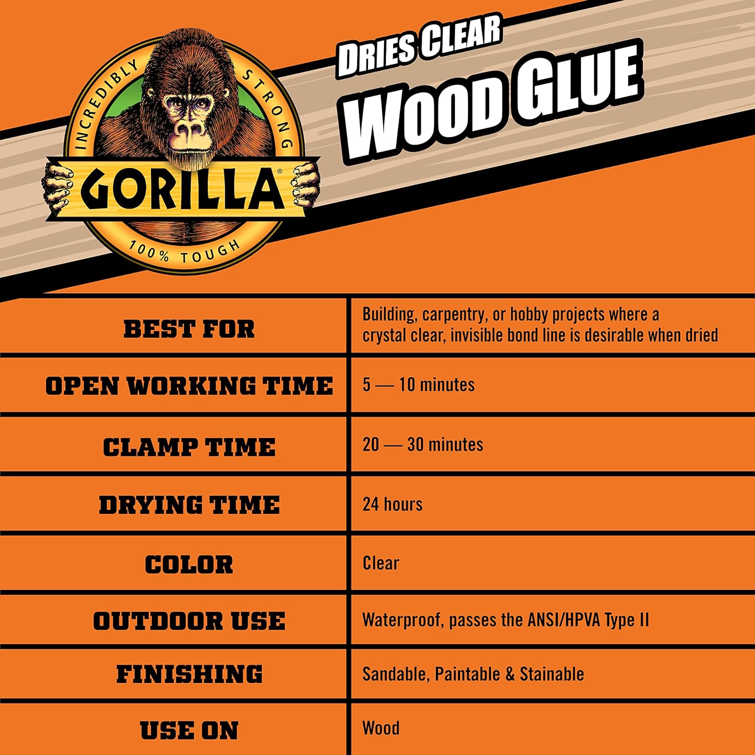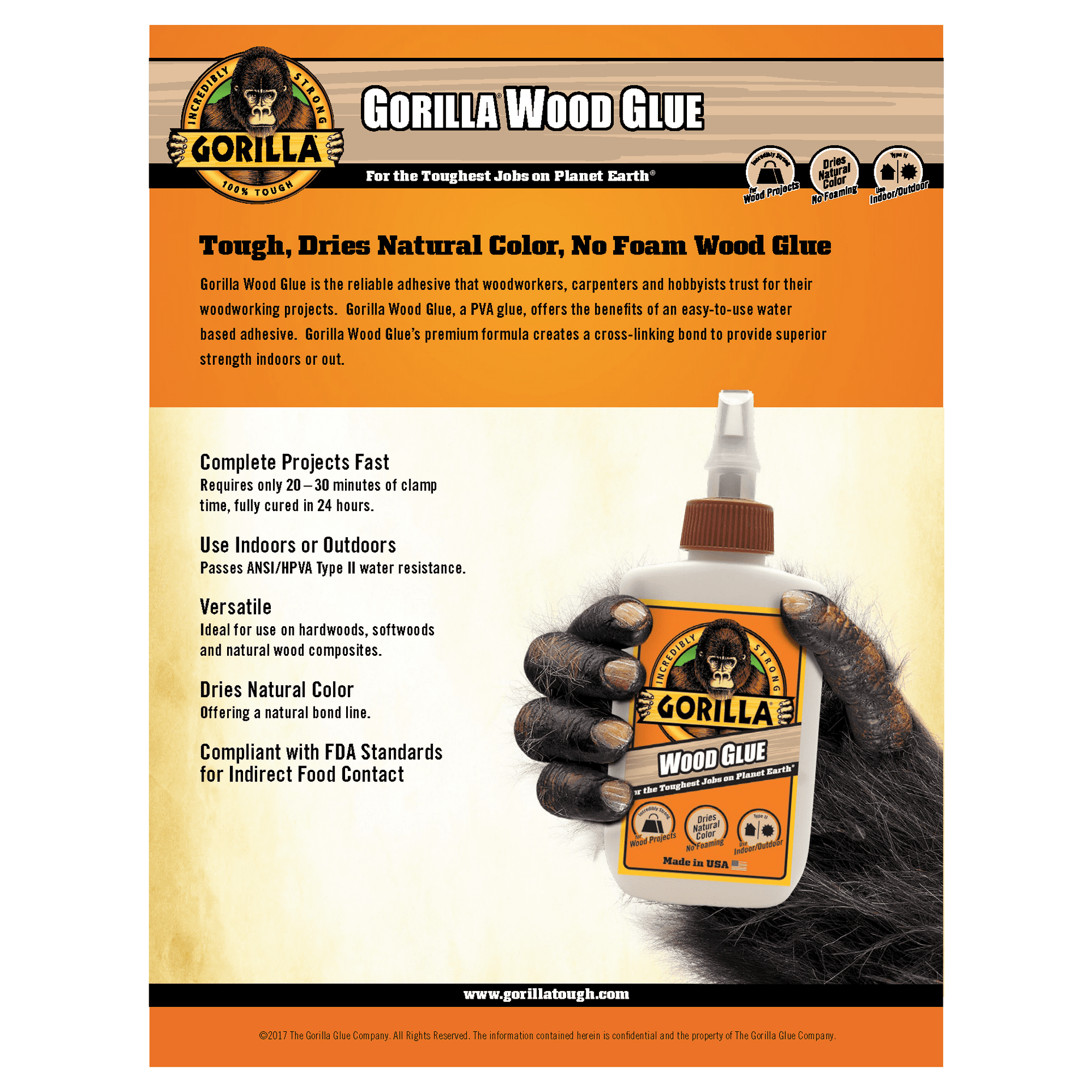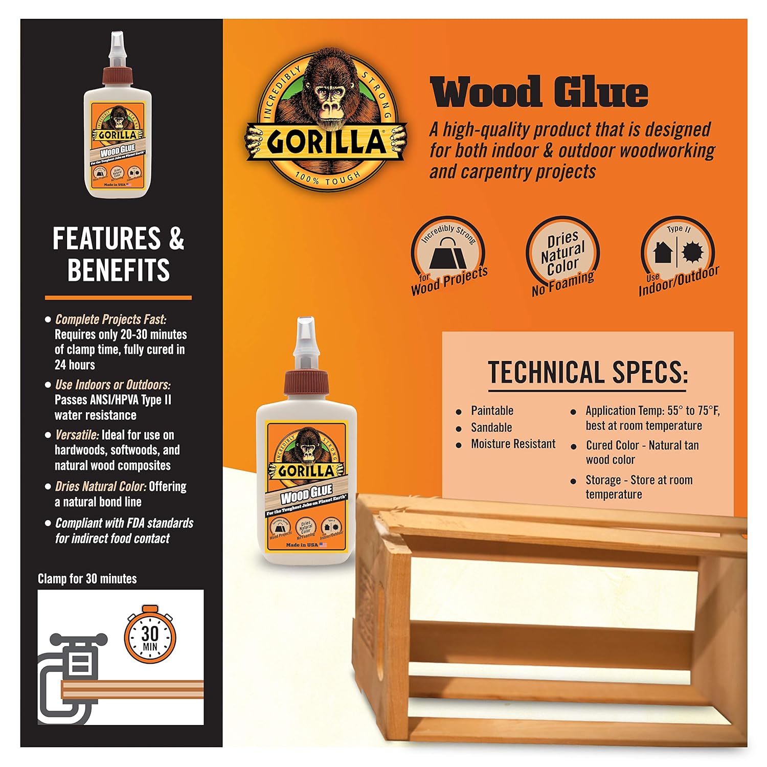 Gorilla Water Based Glue Bottle, Natural Wood Color, Indoor-Outdoor Use, 4 Ounce (Pack Of 8) Gorilla Wood Glue is an adhesive that woodworkers, carpenters, and hobbyists trust for their woodworking projects. Gorilla Wood Glue, a PVA glue, offers the benefits of an easy-to-use, water-based adhesive, with Gorilla strength. This PVA glue is incredibly water-resistant and dries a natural color that offers an invisible bond line for your projects.